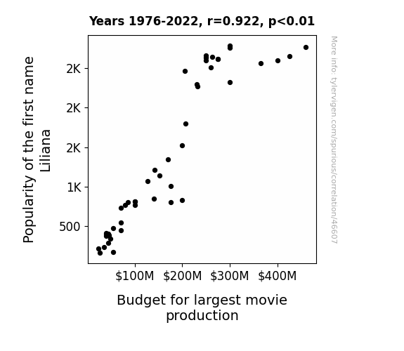 This means 84.9% of the change in the one variable (i.e., Budget for largest movie production) is predictable based on the change in the other (i.e., Popularity of the first name Liliana) over the 47 years from 1976 through 2022.