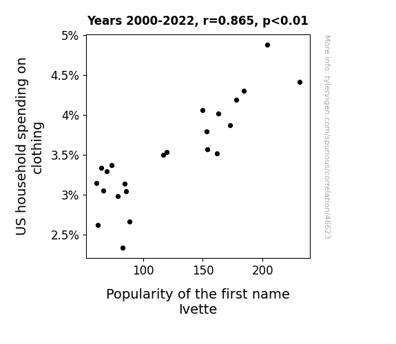 This means 74.9% of the change in the one variable (i.e., Popularity of the first name Ivette) is predictable based on the change in the other (i.e., US household spending on clothing) over the 23 years from 2000 through 2022.