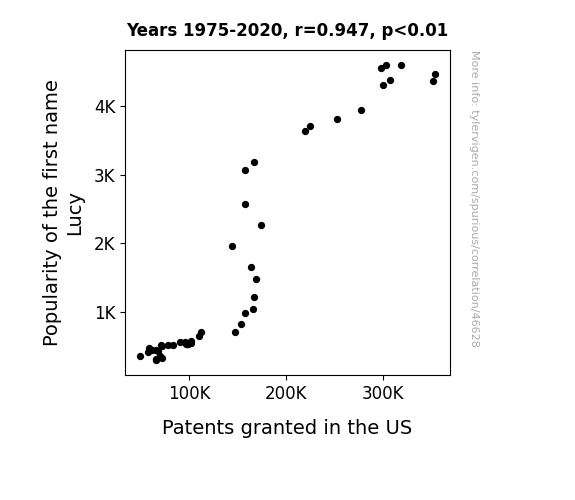 This means 89.6% of the change in the one variable (i.e., Patents granted in the US) is predictable based on the change in the other (i.e., Popularity of the first name Lucy) over the 46 years from 1975 through 2020.