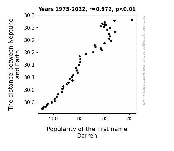 This means 94.5% of the change in the one variable (i.e., Popularity of the first name Darren) is predictable based on the change in the other (i.e., The distance between Neptune and Earth) over the 48 years from 1975 through 2022.