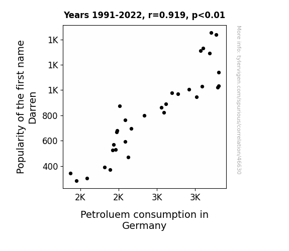 This means 84.5% of the change in the one variable (i.e., Petroluem consumption in Germany) is predictable based on the change in the other (i.e., Popularity of the first name Darren) over the 32 years from 1991 through 2022.