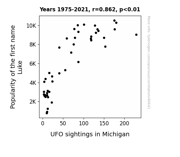 This means 74.4% of the change in the one variable (i.e., UFO sightings in Michigan) is predictable based on the change in the other (i.e., Popularity of the first name Luke) over the 47 years from 1975 through 2021.