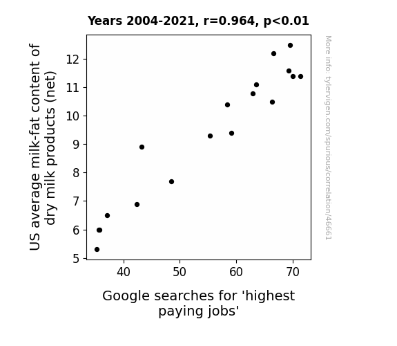 This means 92.9% of the change in the one variable (i.e., Google searches for 'highest paying jobs') is predictable based on the change in the other (i.e., US average milk-fat content of dry milk products (net)) over the 18 years from 2004 through 2021.