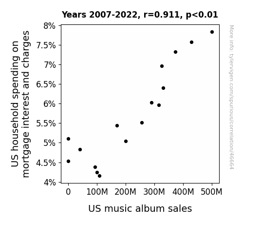 This means 83.1% of the change in the one variable (i.e., US music album sales) is predictable based on the change in the other (i.e., US household spending on mortgage interest and charges) over the 16 years from 2007 through 2022.