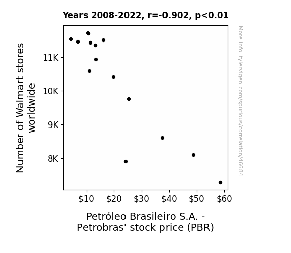 This means 81.3% of the change in the one variable (i.e., Petróleo Brasileiro S.A. - Petrobras' stock price (PBR)) is predictable based on the change in the other (i.e., Number of Walmart stores worldwide) over the 15 years from 2008 through 2022.