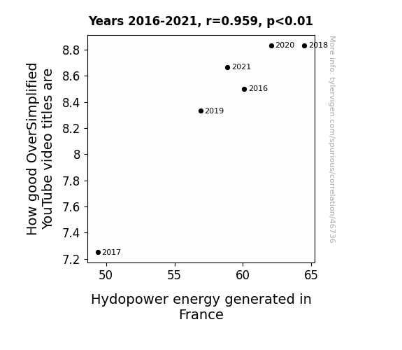 This means 92% of the change in the one variable (i.e., Hydopower energy generated in France) is predictable based on the change in the other (i.e., How good OverSimplified YouTube video titles are) over the 6 years from 2016 through 2021.