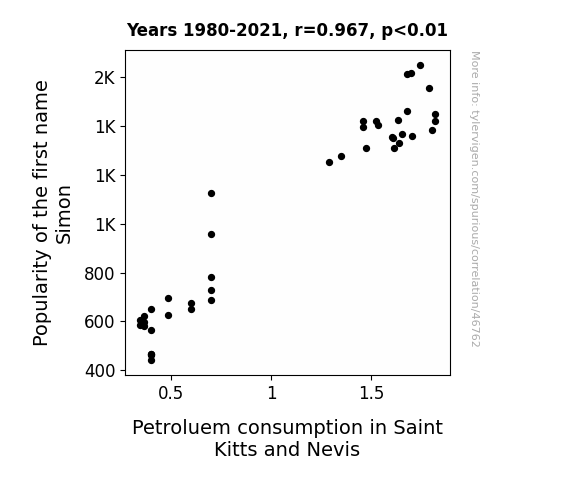 This means 93.5% of the change in the one variable (i.e., Petroluem consumption in Saint Kitts and Nevis) is predictable based on the change in the other (i.e., Popularity of the first name Simon) over the 42 years from 1980 through 2021.