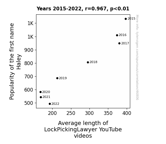This means 93.5% of the change in the one variable (i.e., Average length of LockPickingLawyer YouTube videos) is predictable based on the change in the other (i.e., Popularity of the first name Haley) over the 8 years from 2015 through 2022.