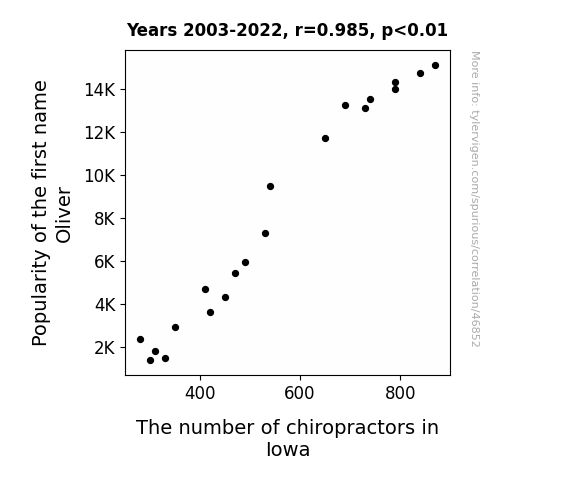 This means 97.1% of the change in the one variable (i.e., The number of chiropractors in Iowa) is predictable based on the change in the other (i.e., Popularity of the first name Oliver) over the 20 years from 2003 through 2022.