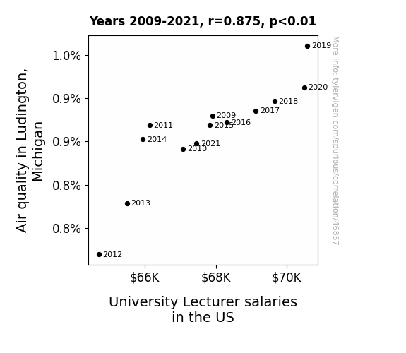 This means 76.6% of the change in the one variable (i.e., University Lecturer salaries in the US) is predictable based on the change in the other (i.e., Air quality in Ludington, Michigan) over the 13 years from 2009 through 2021.