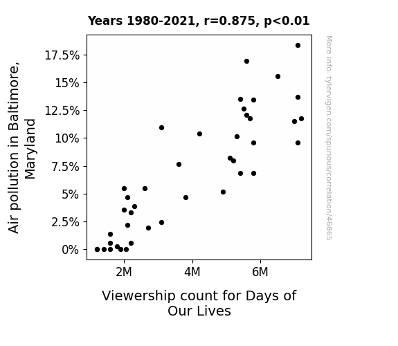 This means 76.5% of the change in the one variable (i.e., Viewership count for Days of Our Lives) is predictable based on the change in the other (i.e., Air pollution in Baltimore, Maryland) over the 42 years from 1980 through 2021.