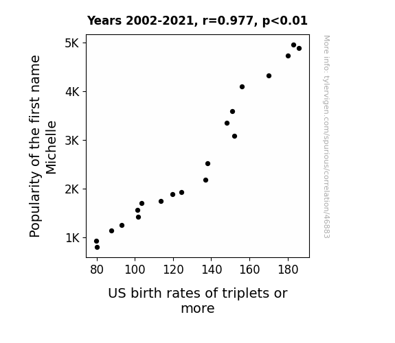 This means 95.5% of the change in the one variable (i.e., US birth rates of triplets or more) is predictable based on the change in the other (i.e., Popularity of the first name Michelle) over the 20 years from 2002 through 2021.
