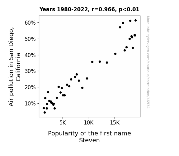 This means 93.2% of the change in the one variable (i.e., Popularity of the first name Steven) is predictable based on the change in the other (i.e., Air pollution in San Diego, California) over the 43 years from 1980 through 2022.