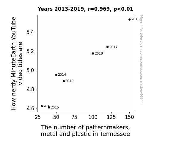 This means 93.9% of the change in the one variable (i.e., The number of patternmakers, metal and plastic in Tennessee) is predictable based on the change in the other (i.e., How nerdy MinuteEarth YouTube video titles are) over the 7 years from 2013 through 2019.