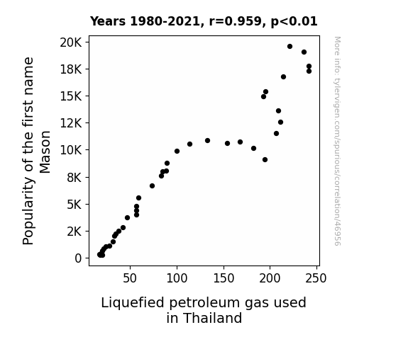 This means 92% of the change in the one variable (i.e., Liquefied petroleum gas used in Thailand) is predictable based on the change in the other (i.e., Popularity of the first name Mason) over the 42 years from 1980 through 2021.