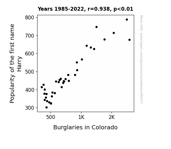 This means 88% of the change in the one variable (i.e., Burglaries in Colorado) is predictable based on the change in the other (i.e., Popularity of the first name Harry) over the 38 years from 1985 through 2022.