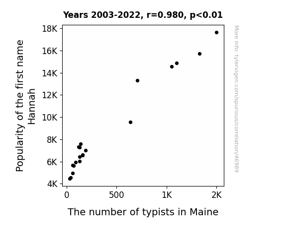 This means 96.1% of the change in the one variable (i.e., The number of typists in Maine) is predictable based on the change in the other (i.e., Popularity of the first name Hannah) over the 20 years from 2003 through 2022.