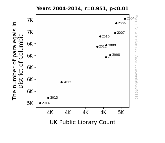 This means 90.4% of the change in the one variable (i.e., UK Public Library Count) is predictable based on the change in the other (i.e., The number of paralegals in District of Columbia) over the 11 years from 2004 through 2014.