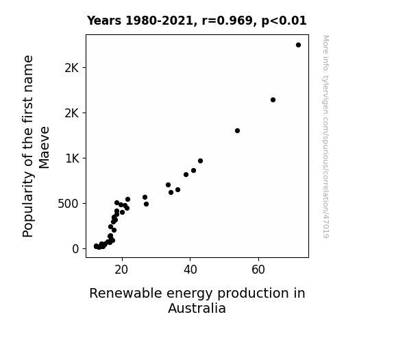 This means 93.8% of the change in the one variable (i.e., Renewable energy production in Australia) is predictable based on the change in the other (i.e., Popularity of the first name Maeve) over the 42 years from 1980 through 2021.