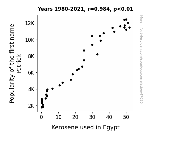 This means 96.8% of the change in the one variable (i.e., Kerosene used in Egypt) is predictable based on the change in the other (i.e., Popularity of the first name Patrick) over the 42 years from 1980 through 2021.