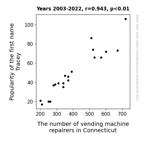 This means 89% of the change in the one variable (i.e., The number of vending machine repairers in Connecticut) is predictable based on the change in the other (i.e., Popularity of the first name Tracey) over the 20 years from 2003 through 2022.