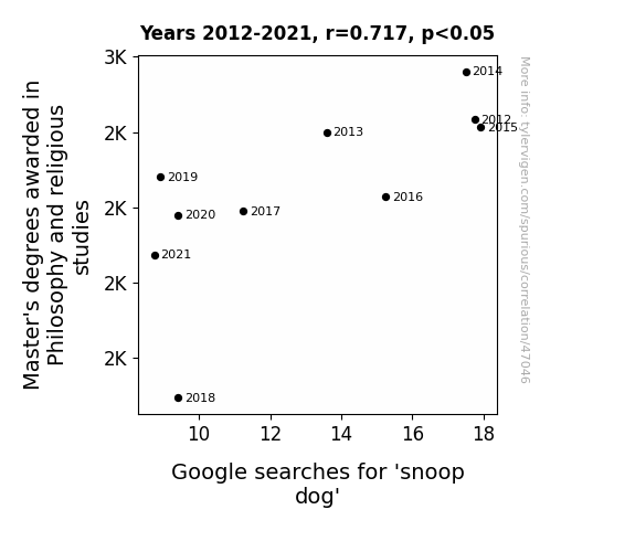 This means 51.5% of the change in the one variable (i.e., Google searches for 'snoop dog') is predictable based on the change in the other (i.e., Master's degrees awarded in Philosophy and religious studies) over the 10 years from 2012 through 2021.