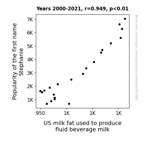 This means 90.1% of the change in the one variable (i.e., US milk fat used to produce fluid beverage milk) is predictable based on the change in the other (i.e., Popularity of the first name Stephanie) over the 22 years from 2000 through 2021.