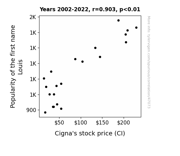 This means 81.5% of the change in the one variable (i.e., Cigna's stock price (CI)) is predictable based on the change in the other (i.e., Popularity of the first name Louis) over the 21 years from 2002 through 2022.