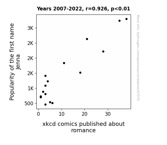 This means 85.8% of the change in the one variable (i.e., xkcd comics published about romance) is predictable based on the change in the other (i.e., Popularity of the first name Jenna) over the 16 years from 2007 through 2022.