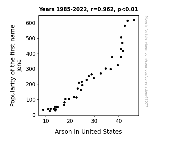This means 92.5% of the change in the one variable (i.e., Arson in United States) is predictable based on the change in the other (i.e., Popularity of the first name Jena) over the 38 years from 1985 through 2022.