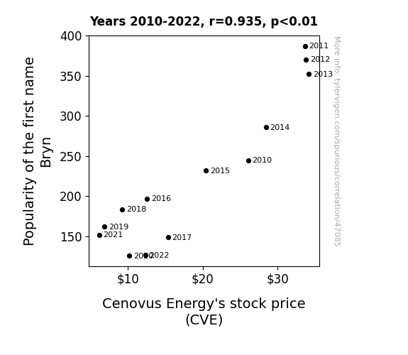 This means 87.3% of the change in the one variable (i.e., Cenovus Energy's stock price (CVE)) is predictable based on the change in the other (i.e., Popularity of the first name Bryn) over the 13 years from 2010 through 2022.