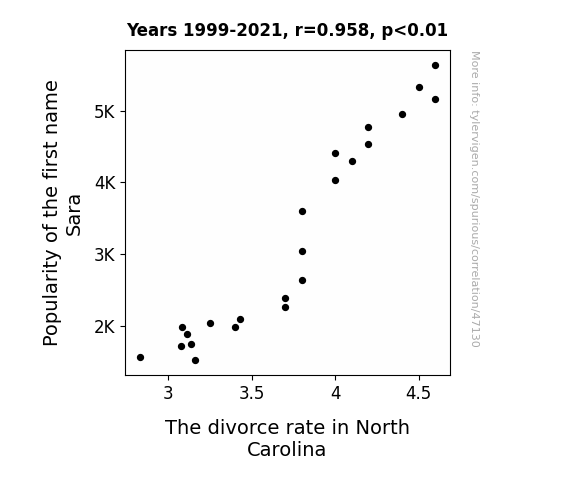 This means 91.7% of the change in the one variable (i.e., The divorce rate in North Carolina) is predictable based on the change in the other (i.e., Popularity of the first name Sara) over the 23 years from 1999 through 2021.