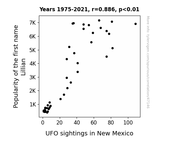 This means 78.5% of the change in the one variable (i.e., UFO sightings in New Mexico) is predictable based on the change in the other (i.e., Popularity of the first name Lillian) over the 47 years from 1975 through 2021.