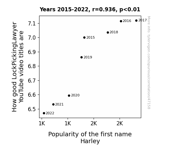 This means 87.6% of the change in the one variable (i.e., Popularity of the first name Harley) is predictable based on the change in the other (i.e., How good LockPickingLawyer YouTube video titles are) over the 8 years from 2015 through 2022.