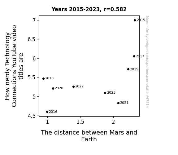 This means 33.9% of the change in the one variable (i.e., The distance between Mars and Earth) is predictable based on the change in the other (i.e., How nerdy Technology Connections YouTube video titles are) over the 9 years from 2015 through 2023.
