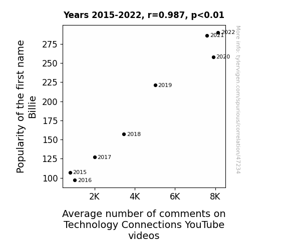 This means 97.5% of the change in the one variable (i.e., Average number of comments on Technology Connections YouTube videos) is predictable based on the change in the other (i.e., Popularity of the first name Billie) over the 8 years from 2015 through 2022.