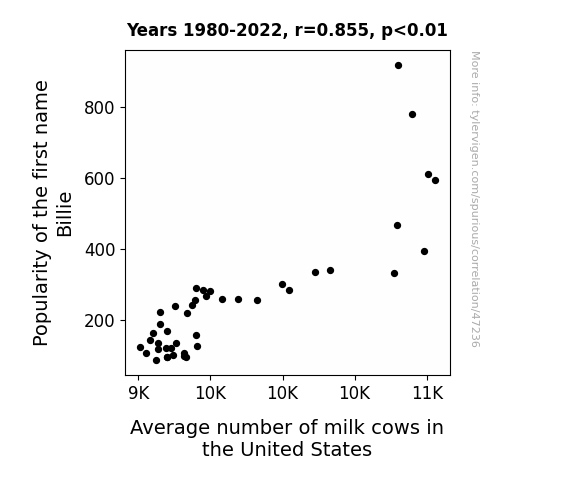 This means 73% of the change in the one variable (i.e., Average number of milk cows in the United States) is predictable based on the change in the other (i.e., Popularity of the first name Billie) over the 43 years from 1980 through 2022.
