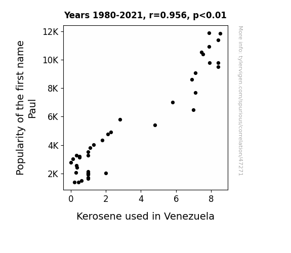 This means 91.4% of the change in the one variable (i.e., Kerosene used in Venezuela) is predictable based on the change in the other (i.e., Popularity of the first name Paul) over the 42 years from 1980 through 2021.