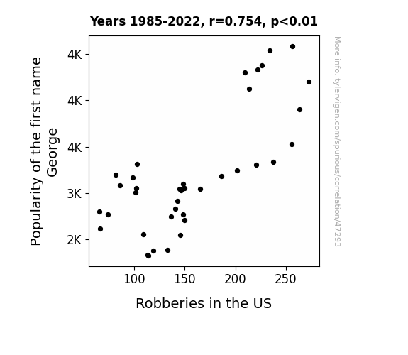 This means 56.9% of the change in the one variable (i.e., Robberies in the US) is predictable based on the change in the other (i.e., Popularity of the first name George) over the 38 years from 1985 through 2022.