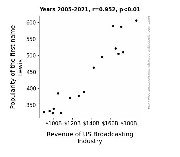 This means 90.6% of the change in the one variable (i.e., Revenue of US Broadcasting Industry) is predictable based on the change in the other (i.e., Popularity of the first name Lewis) over the 17 years from 2005 through 2021.