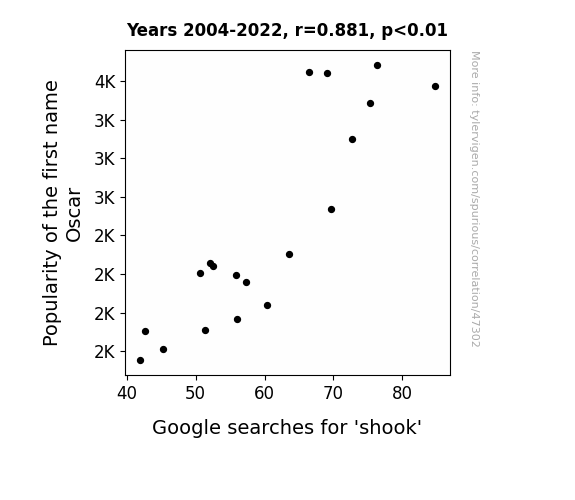 This means 77.7% of the change in the one variable (i.e., Google searches for 'shook') is predictable based on the change in the other (i.e., Popularity of the first name Oscar) over the 19 years from 2004 through 2022.
