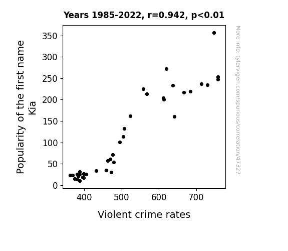 This means 88.8% of the change in the one variable (i.e., Violent crime rates) is predictable based on the change in the other (i.e., Popularity of the first name Kia) over the 38 years from 1985 through 2022.
