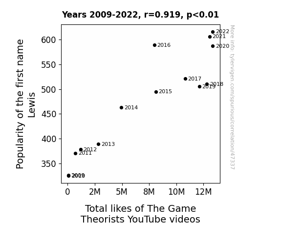 This means 84.5% of the change in the one variable (i.e., Total likes of The Game Theorists YouTube videos) is predictable based on the change in the other (i.e., Popularity of the first name Lewis) over the 14 years from 2009 through 2022.