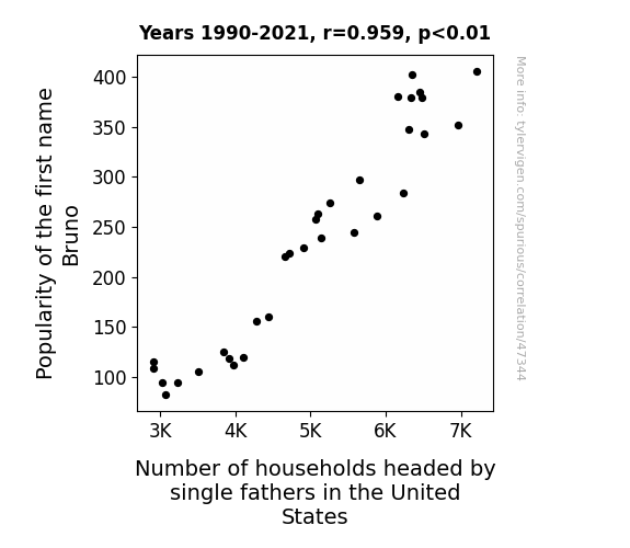 This means 92% of the change in the one variable (i.e., Number of households headed by single fathers in the United States) is predictable based on the change in the other (i.e., Popularity of the first name Bruno) over the 32 years from 1990 through 2021.