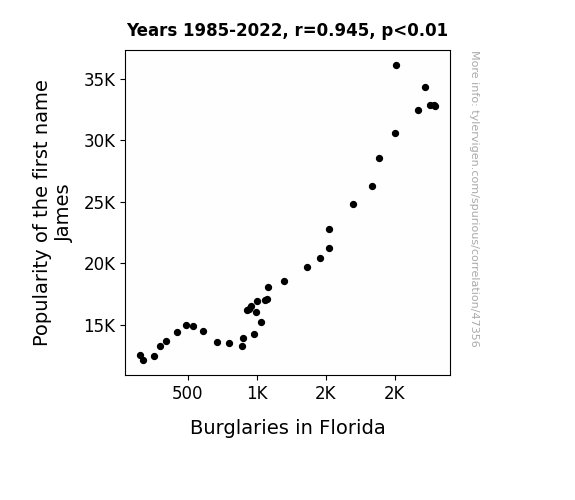 This means 89.3% of the change in the one variable (i.e., Burglaries in Florida) is predictable based on the change in the other (i.e., Popularity of the first name James) over the 38 years from 1985 through 2022.