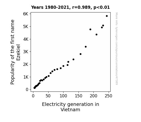 This means 97.9% of the change in the one variable (i.e., Electricity generation in Vietnam) is predictable based on the change in the other (i.e., Popularity of the first name Ezekiel) over the 42 years from 1980 through 2021.