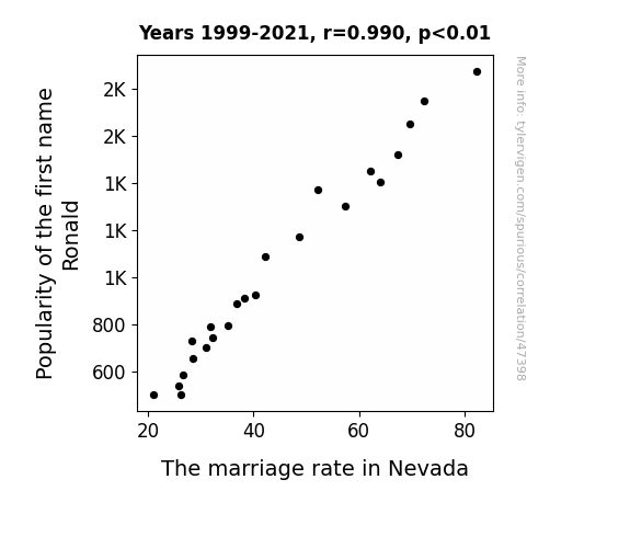 This means 97.9% of the change in the one variable (i.e., The marriage rate in Nevada) is predictable based on the change in the other (i.e., Popularity of the first name Ronald) over the 23 years from 1999 through 2021.