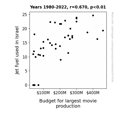 This means 44.8% of the change in the one variable (i.e., Budget for largest movie production) is predictable based on the change in the other (i.e., Jet fuel used in Israel) over the 43 years from 1980 through 2022.