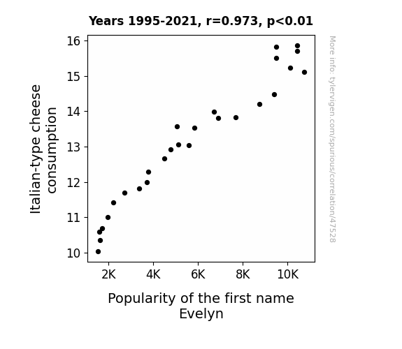 This means 94.8% of the change in the one variable (i.e., Popularity of the first name Evelyn) is predictable based on the change in the other (i.e., Italian-type cheese consumption) over the 27 years from 1995 through 2021.