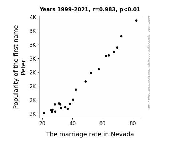 This means 96.7% of the change in the one variable (i.e., The marriage rate in Nevada) is predictable based on the change in the other (i.e., Popularity of the first name Peter) over the 23 years from 1999 through 2021.